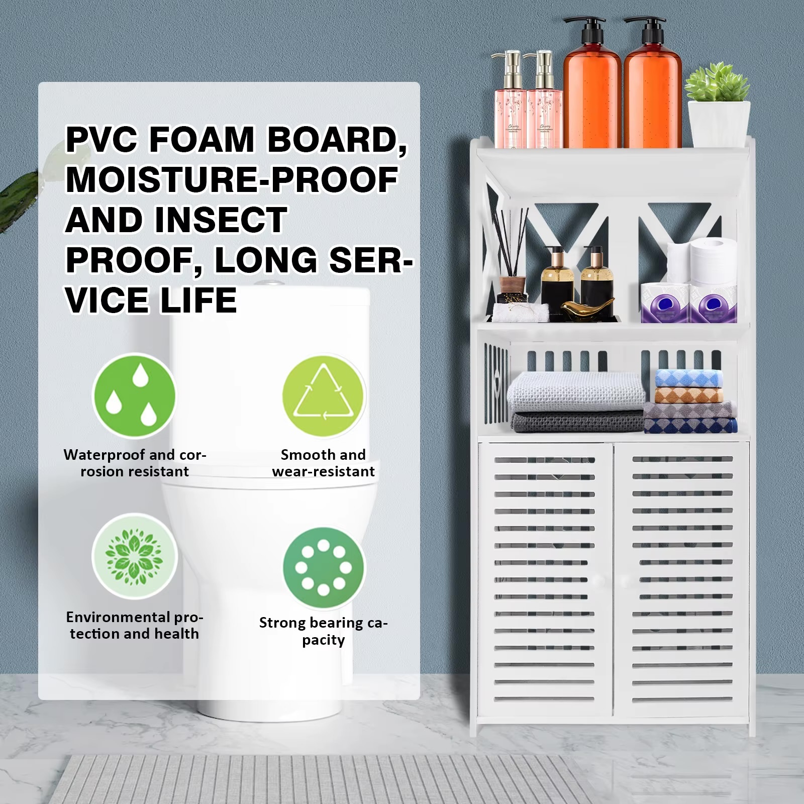 Modern & Durable Design The fashionable double doors bathroom cabinet is made of advanced high quality pvc material, environmental protection, with a high carrying capacity. The maximum load-bearing capacity of a single layer is 5kg. Waterproof and moisture-proof, oil-proof and flame-retardant, suitable used in wet areas and kitchens.