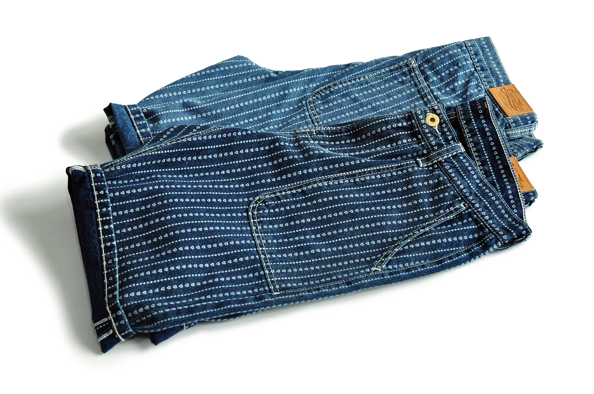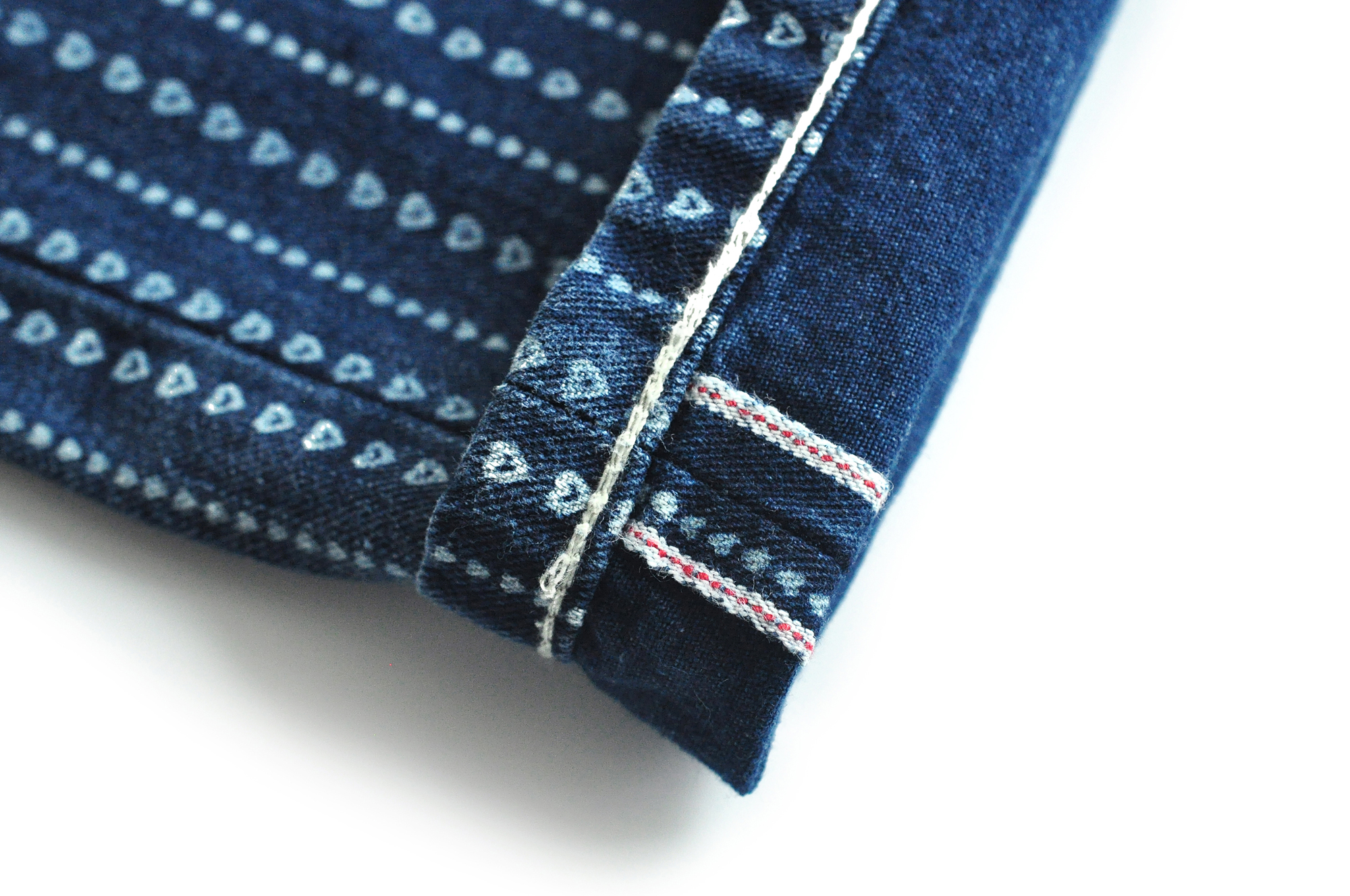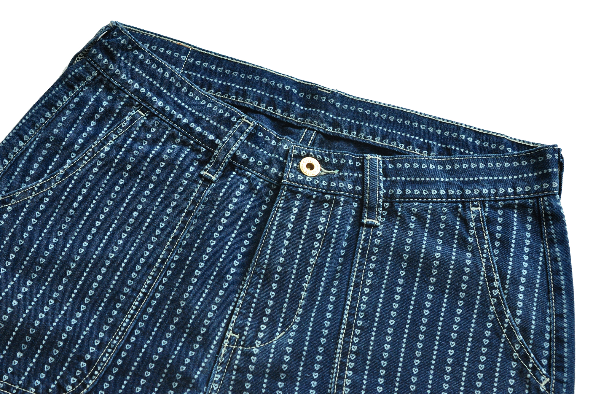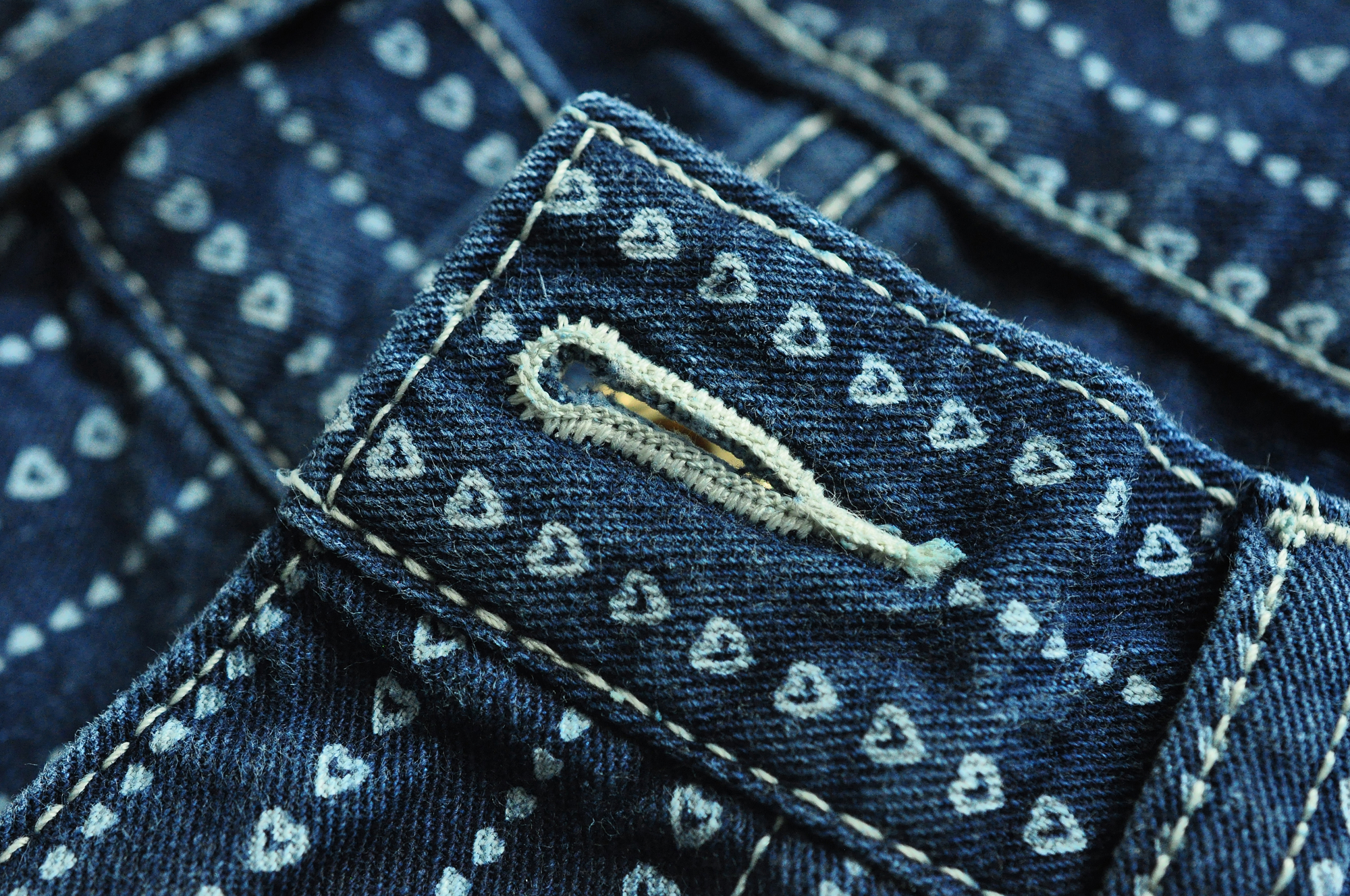 Antique Loom Red Ear Jean Fabric, about 10 Ounces, Just Right in Summer. The Small Peach Heart Is a Discharge Dyeing Process. after the Finished Product Is Washed, the Two Colors Are Very Beautiful.The Fabric Has a Red-Eared Cloth Edge, Which Can Be Worn by Opening the Trousers. Dark Blue Weft Yarn Presents Ancient Fabric Texture.